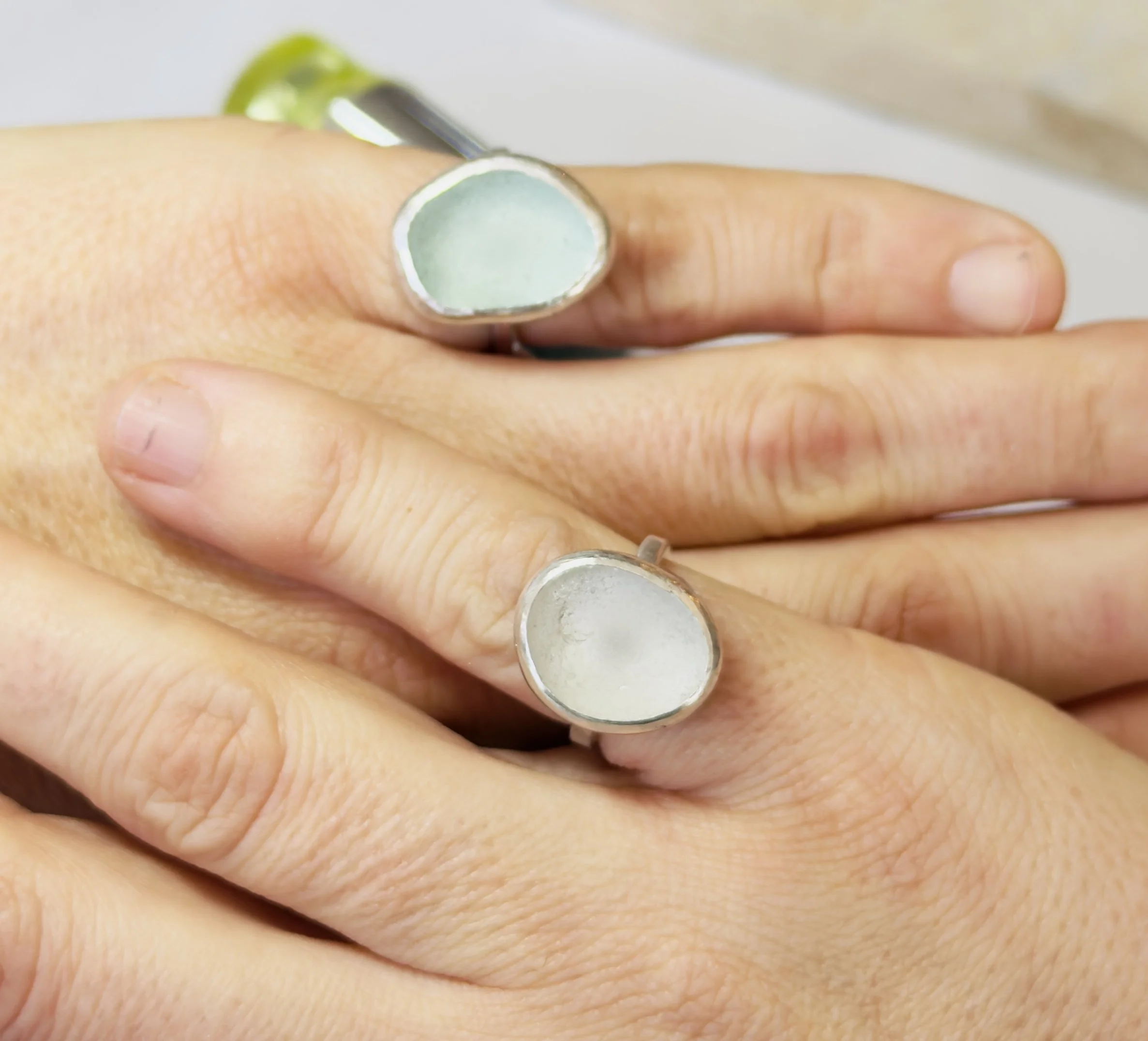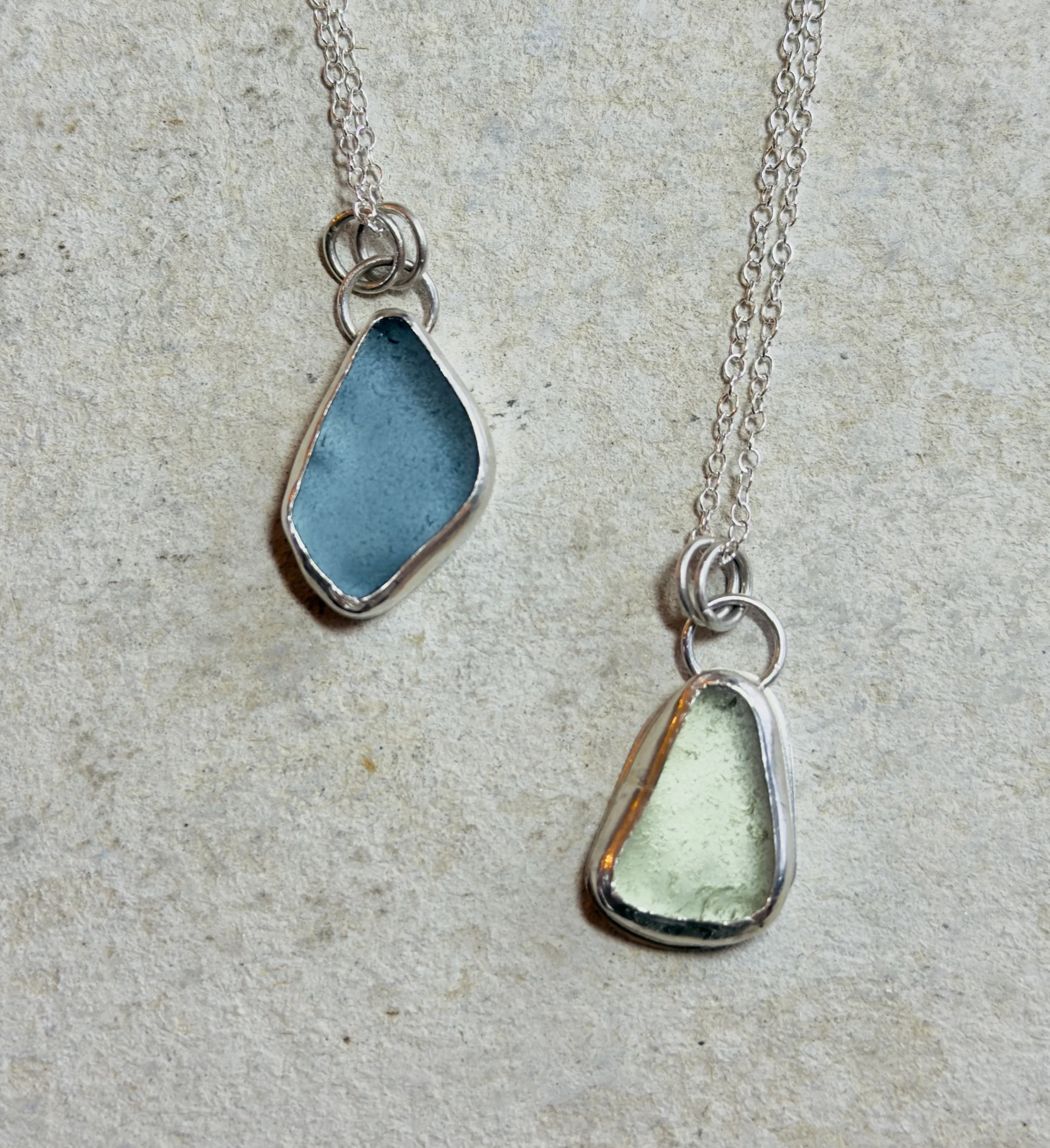 If you would like to bring your own seaglass then you are very welcome. For a ring seaglass needs to be no smaller than 0.8cm x 0.8cm and no bigger than 1.5cm x 1.5cm. For a pendant the maximum size is 2cm by 2cms. The maximum depth for both is 5mm and it should be evenly and well tumbled. It should sit flat on a table with no/little wobble, but if you're unsure, then bring it all along and we can have a look to find the right piece.
