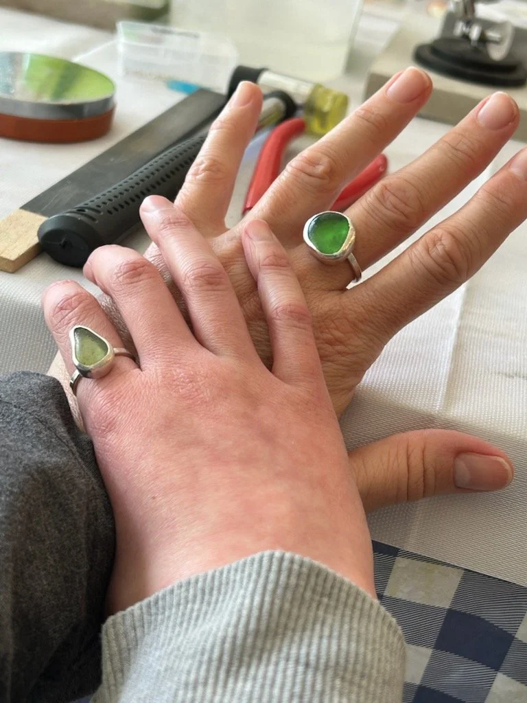 You will learn to design your own ring or pendant from scratch by choosing your seaglass piece. You will make the setting from silver wire and sheet; you’ll learn how to make the perfect size bezel for your glass and solder the back plate, bezel and other parts together. Lastly you will file and polish your piece and set your seaglass. You'll be surprised how much you can learn in 4 hours.